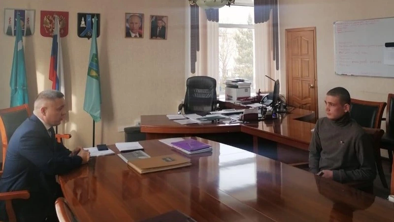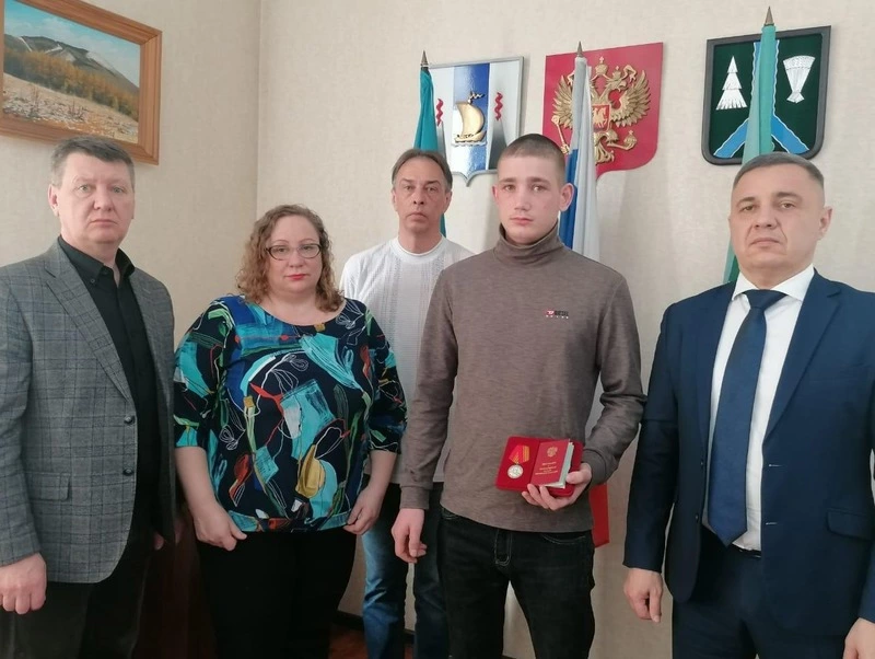 Совместно с представителями военного комиссариата в здании администрации муниципального образования "Тымовский городской округ" была вручена медаль маршала Г.К.Жукова 21- летнему жителю пгт. Тымовское Сергею Майстеру, вернувшемуся домой из зоны проведения СВО.