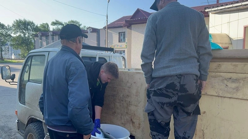 Реализация горбуши производится не только в Тымовском, а еще и в сёлах района, как было в Ясном и Молодежном. Ведь очень удобно приобретать любимый продукт на месте проживания.