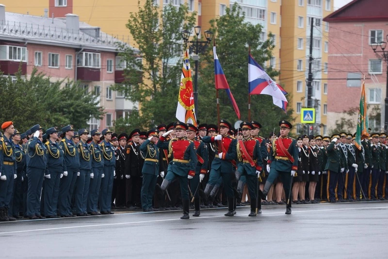 В парадном строю по площади Победы прошли расчеты офицеров, сержантов, солдат островных соединений и воинских частей, а также представители силовых ведомств. Отдельного внимания удостоились военнослужащие-женщины, ученики кадетской школы, кадетского класса УМВД России по Сахалинской области, курсанты УМЦ «Авангард» и Центра «Воин», юнармейцы и казаки.